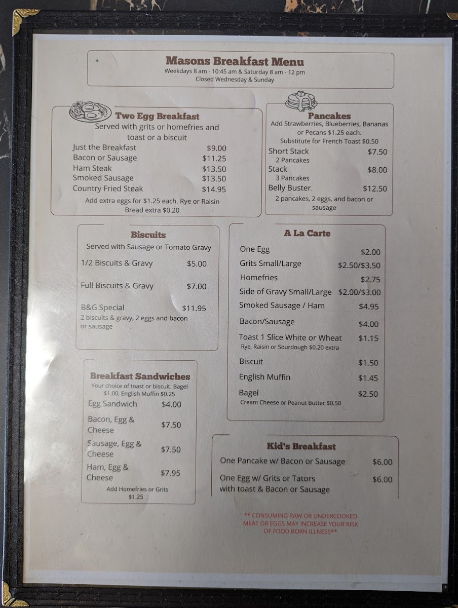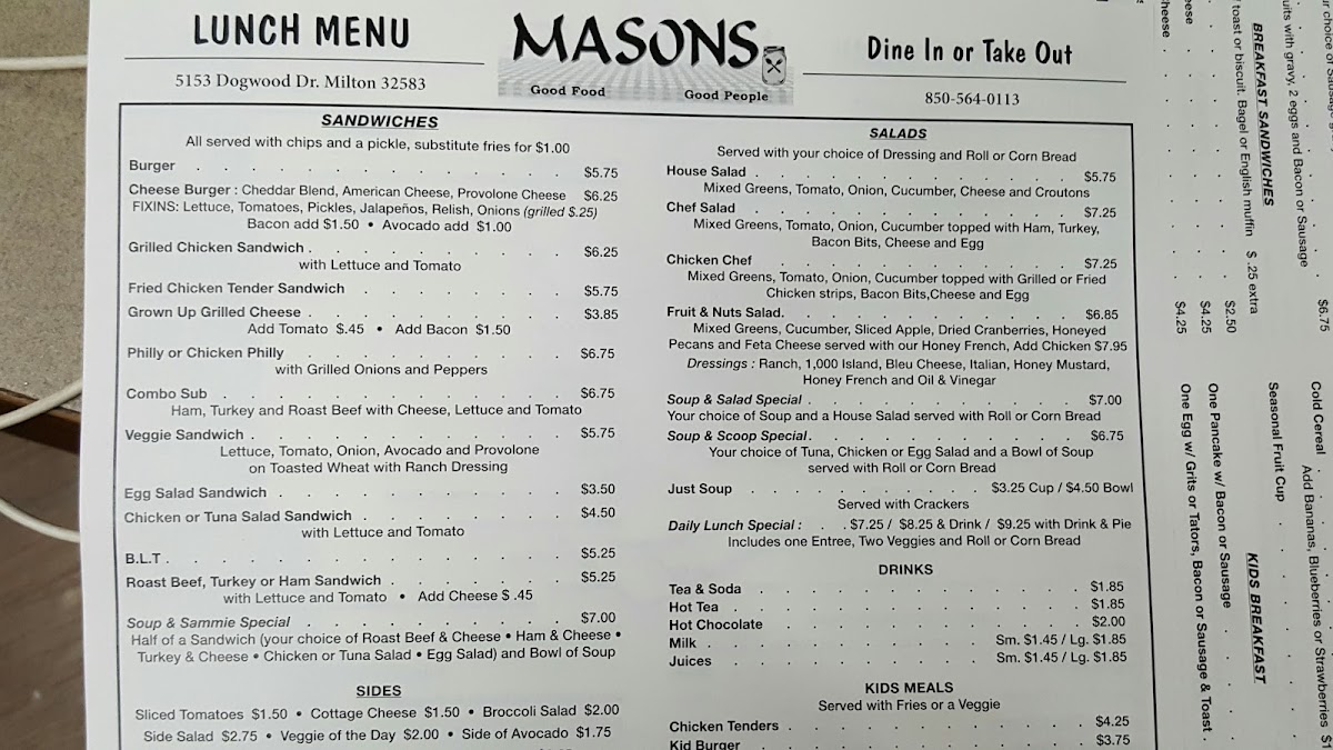 The menu at Masons offers a straightforward, comforting selection that feels right at home in a warm, small-town diner setting. You’ll find classic American breakfast staples like biscuits and gravy, grits, and hearty three-egg omelets alongside satisfying lunch options such as cheeseburgers with fries and seasonal salads.